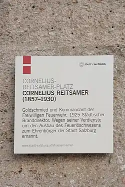 Der Cornelius-Reitsamer-Platz in Salzburg war bis 2019 nach ihm benannt.[6] Um das Andenken an Cornelius Reitsamer (1857–1930), den langjährigen Kommandanten der Freiwilligen Feuerwehr und Branddirektor der Stadt Salzburg, weiterhin zu pflegen, wird die Passage im Bruderhof – dem ehemaligen Standort der Salzburger Freiwilligen Feuerwehr – als Cornelius-Reitsamer-Passage benannt.[7]
