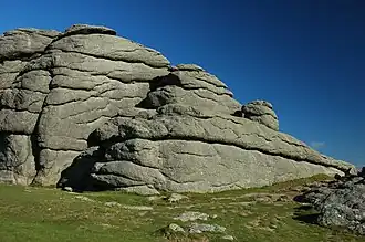 Das Deckgebirge aus nur schwach metamorphen Schiefern und Sandsteinen des Devons und Karbons (Metasedimente und Metavulkanite eines passiven Kontinentalrandes) wurde dann ganz langsam abgetragen,[7] so dass die Granite in Gebieten wie in Dartmoor und Bodmin Moor schließlich an der Oberfläche austraten. Fortgesetzte Erosion setzte den Graniten stark zu, so dass diese jetzt oft nur noch als lose Einzelblöcke – so genannter clitter – erhalten sind.[8]