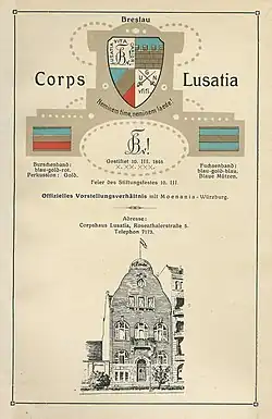 Nach der Kgl. preußischen Kabinettsorder vom 24. November 1811 wurde die Brandenburgische Universität Frankfurt nach Breslau verlegt. Nachdem sich im Oktober 1821 ein Corps Sileso-Lusatia in der schlesischen Hauptstadt aufgetan hatte, gründete stud. iur. Emil Thiele mit sechs anderen Stiftern am 6. November 1832 das Corps Lusatia.[1] Nach Borussia (1819) und Silesia (1821) war es das dritte Corps an der Schlesischen Friedrich-Wilhelms-Universität.[2] Der Wahlspruch war Lusatia vita carior. Die blau-rot-goldenen Farben wurden 1843 in Dunkelblau-Gold-Rot, im Wintersemester 1848 in Hellblau-Gold-Rot geändert; damit sollten die ursprünglichen Landesfarben der Lausitz herausgestellt werden.