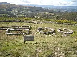 Das ehemalige Dorf der Castrokultur auf dem Hügel besteht aus Gebäuden mit rundem oder länglichem Grundriss und großen Abmessungen. Die Wände bestehen aus unregelmäßig angeordneten Granitsteinen, die als Trockenmauerwerk ausgeführt wurden. Rundhütten weisen eine sorgfältigere Bauweise mit Innen- und Außenverkleidung auf, Hütten mit länglichem Grundriss weisen eine archaischere und grobere Technik auf. Im Zentrum steht ein aus Erde und Steinen erbauter Turm, daneben im Südwesten ein ovaler Bau mit einer Steinbank an der Innenseite. Der Raum ist in seiner Gesamtheit von zwei Mauern und im Westen, wo der Hang weniger steil ist, von einer dritten Mauer umgeben. Die Mauern sind Innen und Außen aus großen Steinblöcken und in der Mitte mit Erde gefüllt. Sie verfügen über kleine Rampen, teilweise mit Stufen, die als Zugang dienen und eine Breite von etwa vier Metern haben. Der einzige Eingang zum Dorf befindet sich im Nordwesten. Neben der Restaurierung von Strukturen wurden auch zwei Hütten gebaut, die die Häuser des Dorfes nachbilden.
