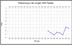 | 21 WM-Spiele 6 Siege 5[1] Unentschieden 10 Niederlagen 22:39 Tore | |