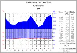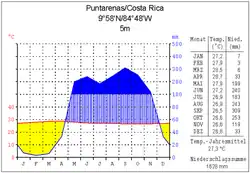 Aufgrund seiner Lage zwischen 8° und 11° nördlicher Breite befindet sich Costa Rica in den Tropen. Allerdings differieren die Niederschläge erheblich: In San José fallen im Jahr 1867 mm, in Puerto Limón an der Karibikküste mit 3518 mm fast doppelt so viel. In Costa Rica sind zwei der tropischen Klimatypen anzutreffen. Die Abgrenzung der beiden Typen wird durch die von Nordwest nach Südost verlaufende Gebirgskette bewirkt. Das wechselfeuchte Klima der Pazifikküste ist durch zwei Jahreszeiten gekennzeichnet: eine Regen- und eine Trockenzeit. Die Regenzeit erstreckt sich im Zentraltal und im nordwestlichen Landesteil von Mai bis November, die Trockenzeit von Dezember bis April. Im niederschlagsreicheren Süden und der zentralen Pazifikküste des Landes setzt die Trockenzeit ein bis zwei Monate später ein und endet ebenfalls im April. Der im zentralen Norden (östlich der großen Gebirgskette) liegende Landesteil liegt in einer klimatischen Übergangszone, in der die Niederschläge während der Trockenzeit der Pazifikregionen Costa Ricas etwas zurückgehen, aber nicht völlig ausbleiben. An der Karibikküste herrscht durch die vorwiegend aus Nordost wehenden Winde, die über der karibischen See Feuchtigkeit aufnehmen, ein äquatoriales Klima mit Niederschlägen zu jeder Jahreszeit vor, wobei die Monate Februar und März sowie September und Oktober trockener ausfallen.[9]