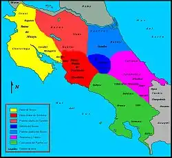 Die frühesten Spuren menschlicher Besiedlung in Costa Rica werden mit der Ankunft von Jäger- und Sammlergruppen vor etwa 12.200 Jahren in Verbindung gebracht. Im Kanton Siquirres wurden 66 menschliche Siedlungen entdeckt, in denen Grabbeigaben, Petroglyphen, Fundamente von Behausungen, Straßen, Steinwerkzeuge und Keramik gefunden wurden, die aus der paläoindianischen Periode stammen und der ethnischen Gruppe der Cabécar zuzuordnen sind, womit es sich um die älteste archäologische Stätte in Mittelamerika handelt.[44] Zwischen 10.000 und 7.000 v. Chr. wurden im Turrialba-Tal archäologische Beweise (Herstellung von Steinwerkzeugen) gefunden, darunter Speerspitzen vom Clovis-Typ (Nordamerika) und Fischschwänze (Südamerika).[45][46] Um 5000 v. Chr. begann die Landwirtschaft, die hauptsächlich auf Knollen und Wurzeln basierte. Im ersten und zweiten Jahrtausend v. Chr. gab es bereits kleine, verstreute, sesshafte Bauerngemeinschaften. Um 2000–3000 v. Chr. taucht die erste bekannte Verwendung von Keramik auf, mit Fragmenten von Töpfen, zylindrischen Gefäßen, Platones, Tecomates und anderen Gefäßformen, die mit Techniken wie Ritzen oder Rillen, Stempeln und Modellieren verziert sind.