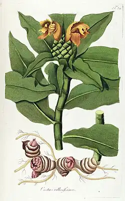 Laut Otto Beßler war Costus (deutsch kost und Kostwurz genannt[4]) im Mittelalter eine Sammelbezeichnung für verschiedene aromatische Drogen des indischen Arzneischatzes, in erster Linie von „Costus speciosus (Koenig) Smith“ (heute Hellenia speciosa, früher auch Cheilocostus specius genannt). Als weitere in Frage kommende Lieferanten für Costus-Sorten nennt er die Indische Kostuswurzel und Canella alba.[5] Die Indische Kostuswurzel (Saussurea lappa; Synonyme: Saussurea costus, Aplotaxis lappa, Theodorea costus, Aucklandia lappa, Aucklandia costus), welche die Costuswurzel (auch Kostuswurzel und früher Kostwurz[6] genannt) liefert, trägt nur einen ähnlichen Namen, gehört jedoch zur Gattung der Alpenscharten (Saussurea) in der Familie der Korbblütler (Asteraceae).
