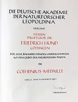 - ↑ Laudatio von Präsident Ernst Schmutzer für Friedrich Hund anlässlich der Verleihung der Cothenius-Medaille 1971.