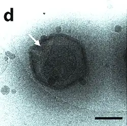 Kryo-EM-Bild von Cotonvirus japonicus mit offenem Stargate (Pfeil).[A. 1] | ||||||||||||||||||||