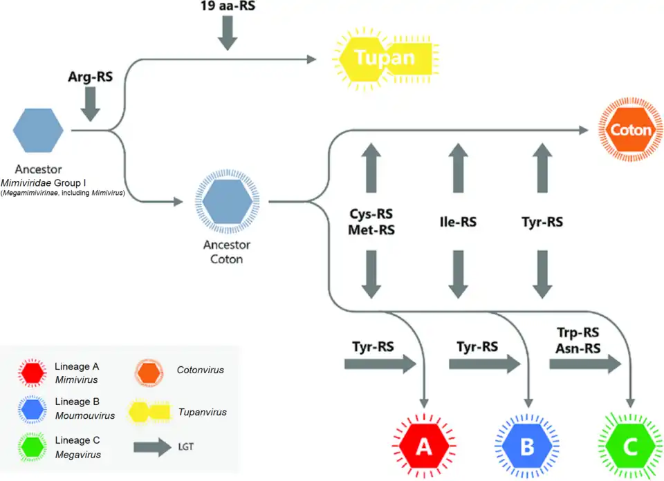 In einem proteomischen Stammbaum ist dieses neue NCLDV phylogenetisch an der Wurzel von drei Linien A, B und C der Mimiviridae-Gruppe I (Mimivirus, Moumouvirus respektive Megavirus) angesiedelt (basal).[4]
