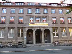Das Gebäude hat eine massive Verkleidung aus Muschelkalksteinen. Das Treppenhaus ist mit Travertinplatten verkleidet.[4] Nicht nur die Fassade des mehrgeschossigen Gebäudes ist beachtenswert, sondern auch der Dachbereich mit den zahlreichen Dachgauben.