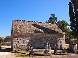 - Die schlichte, aber ebenfalls aus Hausteinen errichtete Friedhofskapelle stammt aus dem 17. Jahrhundert; ihr Dach ist mit Steinschindeln (lauzes) gedeckt, die sich im First verzahnen. Das rückwärtige Fenster wurde vermauert. Die Kapelle ist seit 1979 als Monument historique anerkannt.[3]