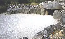 - b) bis auf einen schmalen Zugang geschlossen ist der (Fullcourt) z. B. Ballyglass und Cloghanmore, der im breiteren, gewöhnlich dem östlichen Teil des trapezoiden Steinhügels liegt, obwohl die Untersuchung bei Creevykeel eine Änderung des Hofes anzeigt, der in der zweiten Phase umgebaut worden sein könnte.