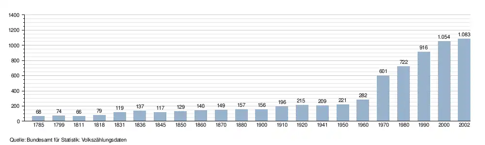 - ↑ Daten der Eidgenössischen Volkszählungen ab 1850 nach Gemeinden. (XLSX; 10 MB) Bundesamt für Statistik, Neuchâtel, 12. Juli 2024, abgerufen am 15. September 2025 (Öffnung in Excel nur über "Anhang/Excel-Datensatz" möglich).