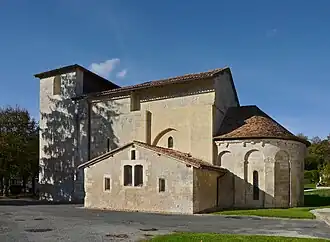 - Die Église Saint-Saturnin stammt ursprünglich aus dem 12. Jahrhundert. Wahrscheinlich im Umfeld des Hundertjährigen Krieges (1337–1453) wurde das nahezu fensterlose Kirchenschiff aufgestockt um eine Flucht- und Wehrkammer zu erhalten und durch einen vorgesetzten Wehr- und Glockenturm zusätzlich gesichert. Während die romanische Apsis eine Blendarkadengliederung zeigt, sind das Langhaus und der Westturm weitgehend schmucklos. Das Kirchenbauwerk ist seit dem Jahr 1947 als Monument historique eingeschrieben.[3]