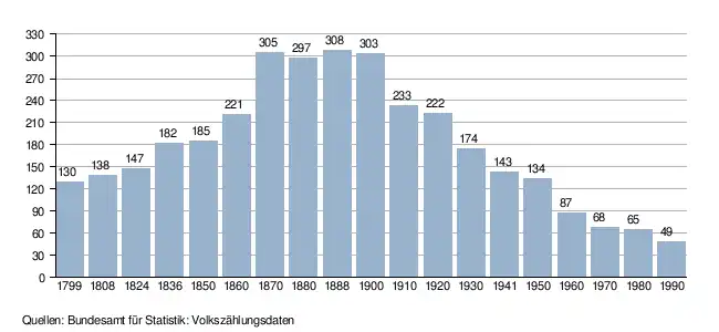 - ↑ Daten der Eidgenössischen Volkszählungen ab 1850 nach Gemeinden. (XLSX; 10 MB) Bundesamt für Statistik, Neuchâtel, 12. Juli 2024, abgerufen am 5. April 2025 (Öffnung in Excel nur über "Anhang/Excel-Datensatz" möglich).