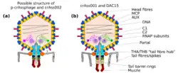 Dieser erste kultivierte Vertreter (Bacteroides-Phage crAss001, ΦcrAss001, Familie Steigviridae) hat eine Podoviren-Morphologie,[9] aber im Gegensatz zu den damals bekannten Podoviren kein lineares, sondern ein zirkuläres Doppelstrang-DNA-Genom mit einer Größe von etwa 97 kbp (Kilo-Basenpaaren) und enthält nach Vorhersage 80 offene Leserahmen (englischOpen reading Frames, ORFs).[6][5]