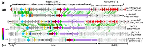 Basierend auf einem Screening verwandter Sequenzen in öffentlichen Nukleotiddatenbanken und einer phylogenetischen Analyse wurde zunächst vorgeschlagen, dass crAssphage Teil der ehemaligen expansiven Phagenfamilie Podoviridae in der damaligen Ordnung Caudovirales ist. Diese Zuordnung entspricht heute dem Morphotyp der Podoviren (kein Taxon!) in der KlasseCaudoviricetes. Die Podoviren stimmten in ihrer Morphologie (Kopf-Schwanz-Architektur mit kurzer Schwanzstruktur) äußerlich mit der tatsächlichen bzw. nur vermuteten Erscheinungsform von crAssphage und den anderen „crAss-like phages“ überein. Auch das Genom der Podoviren bzw. der Klasse Caudoviricetes ist so wie das der crAssphagen ein Doppelstrang-DNA-Molekül. Hauptunterschied ist aber, dass dieses bei den damals bekannten Podoviren linear vorlag, bei den crAssphagen aber zirkulär.[16][5][17][18]