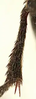 Mit Ausnahme des Endglieds haben alle Hinterleibssegmente auf dem Rücken zwei deutlich voneinander getrennte, nebeneinander liegende Platten, auf dem Bauch zwei sechseckige nebeneinander liegende Platten und auf den Seiten zwei Platten, die obere größer und länglich, die untere kaum kleiner. Alle diese acht Platten sind matt braun und sehr spärlich behaart. Das letzte Abdominalsegment (Abb. 11, Detail 8) ist dunkler, überall stark sklerotisiert und behaart. Es trägt zwei dreigliedrige, jeweils etwa drei Millimeter lange Cerci. Das mittlere Glied ist deutlich kleiner als die beiden anderen. Die beiden Cerci entspringen am Ende des Rückens und stehen nach hinten und oben ab. Auf der Bauchseite trägt das letzte Abdominalsegment eine zwei Millimeter lange röhrenförmige Verlängerung, durch die der Verdauungstrakt entleert.