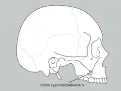 Die Crista zygomaticoalveolaris ist eine Knochenleiste beidseits am Oberkiefer des Menschen. Sie liegt am Übergang vom Jochbein (Os zygomaticum) zum Oberkiefer (Maxilla) oberhalb des ersten Molaren (großer Backenzahn). Die beiden Cristae zygomaticoalveolares gehören neben dem Stirnnasenpfeiler (Crista nasomaxillaris) und den paarigen Flügelgaumenpfeilern (Crista pterygomaxillaris) zu den fünf vertikalen Stützpfeilern des Mittelgesichts.[1] Die Crista zygomaticoalveolaris bildet einen Teil der Außenwand der Kieferhöhle (Sinus maxillaris) und des Processus alveolaris maxillae (Knochenteil in dem sich die Alveolen (Zahnfächer) befinden). Kranial (oberhalb) der Crista zygomaticoalveolaris liegt das Foramen infraorbitale, durch das der Nervus infraorbitalis austritt. Die Knochenfläche beträgt bei Erwachsenen etwa 1,5 – 2 cm2.