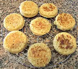 Ein englischer Crumpet ist ein dicker Pfannkuchen, hergestellt aus Hefeteig mit Milch. Zur Verstärkung der Triebkraft der Hefe wird Backsoda hinzugegeben.[1] Crumpets werden hauptsächlich in Großbritannien, jedoch auch in den ehemaligen Kolonien Großbritanniens verzehrt. In Schottland bezeichnet Crumpet einen großen, dünnen Pfannkuchen, der aus denselben Zutaten bereitet wird wie der traditionelle Scotch pancake.