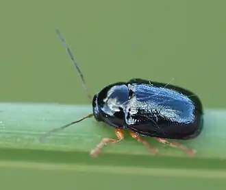 Die Käfer erreichen eine Körperlänge von 3–4,5 mm.[1][2] Sie besitzen eine blauschwarze Grundfarbe mit Metallschimmer. Der Vorderkopf oberhalb des pechschwarzen Munds bis an die Facettenaugen heranreichend ist gelb. Die etwa vier basalen Fühlerglieder sind gelb, die restlichen sind verdunkelt. Die Käferart weist einen Geschlechtsdimorphismus auf. Die Männchen besitzen an der Innenseite der Augen oberhalb des Fühleransatzes jeweils einen kleinen gelben Fleck. Ihre mittleren und hinteren Beine sind schwarz, die vorderen Femora sind teils verdunkelt, ansonsten sind die vorderen Beine gelb. Bei den Weibchen sind alle Beine vollständig gelb gefärbt. Die Mandibeln sind bei beiden Geschlechtern gelb. Die Elytren weisen in den meisten Fällen regelmäßige Punktstreifen auf.[1][2] Die Fühler sind bei den Männchen etwa so lang wie ihre Körpergröße, bei den Weibchen sind diese deutlich kürzer.