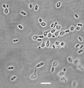 Sprossende Zellen von Kockovaella libkindii, der Balken entspricht 10 µm | ||||||||||||
