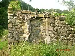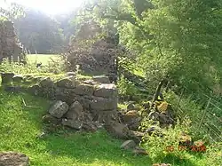 Ein ungewöhnliches Gebäude eines gewissen Alters steht als große Ruine in der Aue am Südufer des Flusses Annick Water. Eine Straße durch den Wald verbindet die Ruine mit den Stallungen und dem Standort des ehemaligen Landhauses. Die Überreste dieses Gebäudes bestehen aus ziemlich großen Flusssteinen und stark bearbeiteten und behauenen Sandstein-Werksteinblöcken. Die Ruine hat eine große Tür mit Fenster zur Aue hin, während die Mauer zum Fluss hin größtenteils zusammengebrochen ist; in ihr könnten zwei große Fenster gewesen sein. Die Tür wurde sorgsam zugemauert und das Fenster zur Aue hin könnte in einen Eingang umgewandelt worden sein.