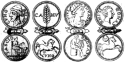 Cunobelinus wird von den klassischen Historikern Sueton und Cassius Dio nur flüchtig erwähnt.[2] Sein Name erscheint jedoch auch auf zahlreichen Münzen, und aus diesen numismatischen Zeugnissen können über ihn einige ergänzende Informationen zu den spärlichen Aufzeichnungen der Historiker gewonnen werden.