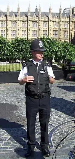 Polizist mit Custodian helmet vor dem Palace of Westminster in London