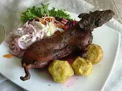 Meerschweinchen werden in der Andenregion in Peru, Bolivien, Ecuador und Kolumbien gegessen. In Peru werden bis zu 65 Millionen Meerschweinchen im Jahr verzehrt, von denen aber nur ein Bruchteil Cuys sind. Die meisten verzehrten Meerschweinchen in Peru haben ein Gewicht von 500 bis 600 Gramm, es handelt sich also um Criollos, somit Hausmeerschweinchen.[24] Das Gewicht, mit dem Cuys aus den professionellen Großzuchtbetrieben ihrer Verwertung zugeführt werden, liegt hingegen bei einem Kilogramm.[25] Nicht nur für die ländliche Bevölkerung sind Meerschweinchen eine Alltagsspeise und ein wichtiger Proteinlieferant. Geschmacklich liegt es zwischen Hühnchen und Schwein, es hat keinerlei Wildgeschmack, aber eine ausgeprägte Kruste. Ein traditionelles Rezept ist Cuy chactado.