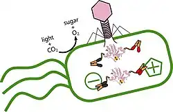 Cyanobakterien sind ein Phylum von Bakterien, die ihre Energie durch den Prozess der Photosynthese gewinnen.[1][2] Obwohl Cyanobakterien wie eukaryotische Pflanzen einen photoautotrophen Stoffwechsel haben, besitzen sie als echte Bakterien eine prokaryotische Zellstruktur. Cyanophagen kommen sowohl im Süß- als auch im Salzwasser (Meerwasser) vor.[3]