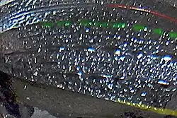 | Abb. 4: Ausschnitt Flügeldecke, teilweise koloriert; rot: Flügeldeckennaht; grün: 1. Kettenstreifen gelb: Kante zum unter- geschlagenen Teil des Elytrons |