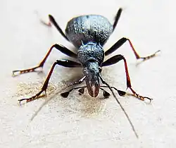 Der Käfer zeigt die typische Form eines Schaufelläufers mit langem Kopf, sehr schlanken Halsschild und langen Laufbeinen.