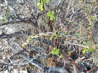 Die Blüten sind hellgrün bis grünlich gelb. Die grünen bis roten Früchte sind fleischig und bedornt. Sie sind 1,8 bis 2,8 Zentimeter lang und weisen Durchmesser von 7 bis 9 Millimeter auf. Die Früchte proliferieren häufig und sind oft steril.