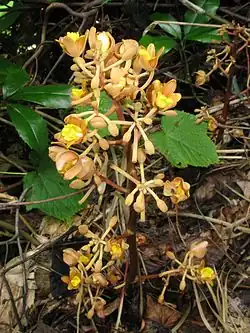 Der Spross endet in einem traubigen Blütenstand. Die Blüten sind bei einigen Arten resupiniert, bei anderen nicht. Sie sind meist gelb oder hellbraun, auch weiße oder grünliche Blüten kommen vor. Die Sepalen sind fleischig, außen bemehlt oder behaart.[1] Die Petalen sind kleiner, dünner in der Textur, am Rand bei manchen Arten bewimpert. Die Lippe ist rundlich oder undeutlich dreilappig, ebenfalls gelegentlich bewimpert, die Seiten sind nach oben geschlagen und haften der Säule an. Auf der Lippe befinden sich meist zahlreiche Haare. Die Säule ist gebogen, am Grund teilweise mit Drüsen besetzt, an der Spitze seitlich verbreitert („geflügelt“). Das Staubblatt ist gegenüber der Säulenachse hinabgebogen, zweikammrig, die beiden Pollinien sind von körnig-pudriger Konsistenz. Die Frucht ist fleischig und öffnet sich nicht; es handelt sich also, ungewöhnlich für die generell Kapseln bildenden Orchideen, um eine Beere. Die Früchte sind zur Reife meist rot und glänzend. Ebenfalls ungewöhnlich sind die Samen: Sie sind oval, mit einer mehrere Zellschichten dicken, verhärteten Samenschale. Samen von Cyrtosia septentrionalis messen etwa 0,75 × 0,5 Millimeter. Der Same wird komplett von einem großen Embryo ausgefüllt. Außen läuft ein Ring oder angedeuteter Flügel rings um den Samen.[2] Die Ausbreitung der Samen von Cyrtosia erfolgt wahrscheinlich endozoochor.[1]