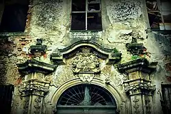 - Im Dorf befindet sich ein um 1735 im Barock erbautes dreistöckiges Schloss (Pałac). Über dem Eingang befindet sich das Wappen des Barons Zygmunt von Zeydlitz und Leipe (links) und seiner Frau Eleonora geb. Freiin von Czettritz und Neuhaus (rechts). Im Herrenhaus befanden sich vormals bedeutende Gemälde,[10] so unter anderem von Anton Graff. Seit 1845 diente das Gebäude, das heute eine Ruine ist, als adeliges Fräuleinstift der Familie von Zedlitz.