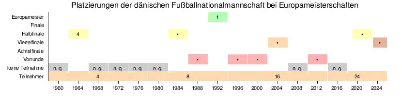 Dänemark nahm 2024 zum zehnten Mal an der Endrunde zur Europameisterschaft teil, davon einmal bei vier Teilnehmern, dreimal an einer Endrunde mit acht Teilnehmern, viermal mit 16 Teilnehmern und zweimal mit 24 Teilnehmern.