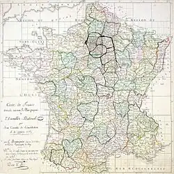 Die Départements wurden ebenso wie die Gemeinden 1789/1790 im Laufe der Französischen Revolution eingeführt. Am 3. November 1789 schlug der Abgeordnete in der NationalversammlungJacques Guillaume Thouret in Anlehnung an einen Entwurf von Emmanuel Joseph Sieyès die Einteilung Frankreichs in 80 Départements („Unterabteilungen“) vor. Diese sollten, soweit möglich, Rechtecke mit einer Seitenlänge von 18 Meilen (etwa 72 Kilometer) sein und in gleichermaßen rechteckige Distrikte und Kantone weiter unterteilt sein. Graf Mirabeau schlug demgegenüber eine Einteilung in 120 Départements vor, deren Grenzen sich an den natürlichen Gegebenheiten orientieren sollten. Die Département-Gesetze vom 22. Dezember 1789 und vom 26. Februar 1790 folgten im Wesentlichen den Entwürfen Mirabeaus, indem Frankreich in 83 ungefähr gleich große Départements aufgeteilt wurde.[6] Als Maßstab für die Größe eines Départements wurde dabei festgelegt, dass die Grenze von der Hauptstadt des Départements nicht weiter als einen Tagesritt zu Pferd entfernt sein dürfe. Diese Neugliederung Frankreichs in Départements trat am 4. März 1790 in Kraft.