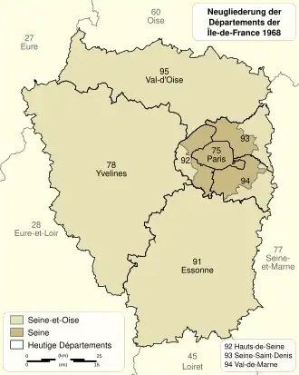 Als die 1871 verlorenen Gebiete 1919 wieder an Frankreich kamen, wurden die alten Départementsgrenzen von vor 1871 nicht wiederhergestellt, sondern die zurückgewonnenen Gebiete in Form dreier Départements (Moselle, Bas-Rhin und Haut-Rhin) reorganisiert. Seither sind die Départementsgrenzen weitgehend unverändert geblieben. Lediglich 1968 erfolgte eine Neuaufteilung der Départements der Île-de-France (s. u.) und 1975 wurde das Département Corse in die beiden Départements Corse-du-Sud und Haute-Corse aufgeteilt.
