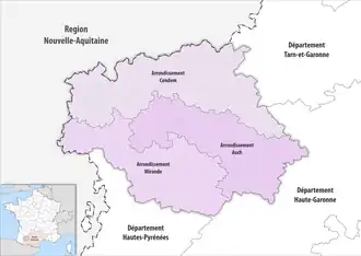 Das Département grenzt an die Départements Hautes-Pyrénées, Haute-Garonne, Tarn-et-Garonne, Lot-et-Garonne, Landes und Pyrénées-Atlantiques.