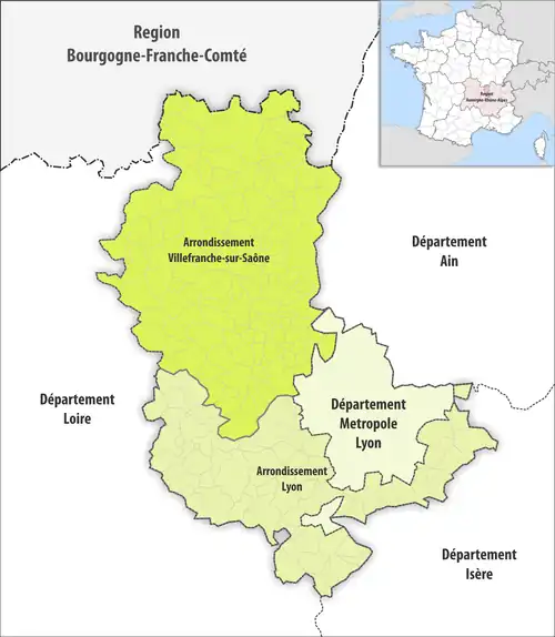 Zum 1. Januar 2015 wurden die Gemeinden der Communauté urbaine de Lyon aus dem Département Rhône ausgegliedert, zugleich wurde aus dem Gemeindeverband eine Gebietskörperschaft mit Sonderstatus und Bezeichnung Métropole de Lyon, die die Aufgaben eines Départements und eines Gemeindeverbands ausübt.[2]