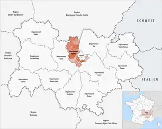 ![]() Lage des Départements Rhône in der Region Auvergne-Rhône-Alpes | |
