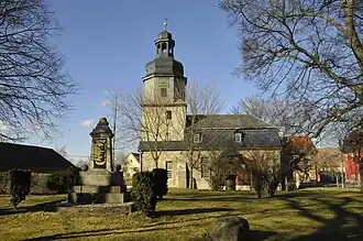- Die evangelische Kirche ist eine rechteckige, verputzte und massive Saalkirche von 1583. Sie hat einen westlichen, stattlichen Dachturm auf dem Mansarddach des Umbaus von 1723. Ende des 19. Jahrhunderts wurde eine polygonale, neugotische Apsis angebaut und innen ausgemalt. Im Inneren zeigt sich ein flaches Holztonnengewölbe und eine eingeschossige Empore sowie der Rest eines Kanzelaltars aus dem 18. Jahrhundert. Die Glocke von 1518 ist von Heinrich Ziegler aus Erfurt. Sie läutet gemeinsam mit einer 1933 von Franz Schilling Söhne (Apolda) gegossenen Bronzeglocke.[5]