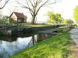 Schleuseneinfahrt mit Unterdükerung und Überlauf in den unten durchlaufenden Graben am Süd-Nord-Kanal
