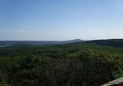 | Blick von Gießen vorbei an den Burgen Vetzberg (links) und Gleiberg (rechts) nordwestwärts zum Dünsberg | ||