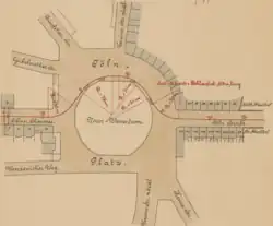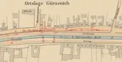 Am Gasthof Fuchs bog die Strecke nach links in die heutige Schillingsstraße ein. Die Endstation lag in Höhe der Gürzenicher Kirche. Dort gab es ein Nebengleis zum Umsetzen von Beiwagen.