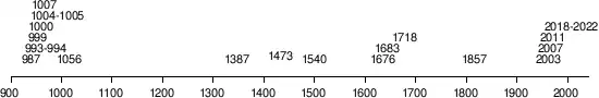 | 1069 | England | Dürre: fast 50.000 Menschen verhungerten. Viele mussten sich in Leibeigenschaft verkaufen, um zu überleben.[15] |
