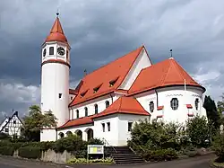 Die evangelische Kirche Dürrwangen wurde 1912 bis 1914 erbaut, nachdem die Vorgängerkirche nach einem Erdbeben abgebrochen werden musste.