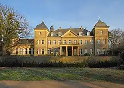 Im Zuge der Beilegung des Jülich-Klevischen Erbfolgestreits gehörte Düsseldorf mit dem Herzogtum Jülich-Berg zum damals zunächst noch protestantischen Haus Pfalz-Neuburg,[34] einem Zweig des Adelsgeschlechtes der Wittelsbacher. In der ersten Phase der pfälzischen Herrschaft kam es zu schweren Auseinandersetzungen zwischen römisch-katholischen, lutherischen und reformierten Beamten bei Hof und in der Stadt.[35] Unter dem Einfluss seiner Frau, Magdalene von Bayern, konvertierte Erbprinz Wolfgang Wilhelm 1613 zur römisch-katholischen Konfession,[36] wodurch er sich in den politischen Auseinandersetzungen seiner Zeit die Unterstützung der Katholischen Liga sichern konnte. Mit der Übernahme der Pfalzgrafen- und Herzogswürde im Jahre 1614 führte die Konversion Wolfgang Wilhelms in seinen Territorien zu einer Repression der protestantischen Konfessionen und zu einer Begünstigung der römisch-katholischen Kirche. Bei der nun einsetzenden Gegenreformation hatten die bei Hof verkehrenden Jesuiten eine Schlüsselrolle.[37]