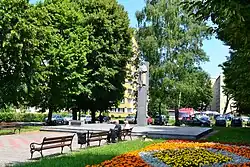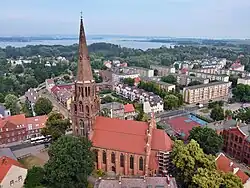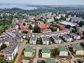 Die kleine Altstadt weist, wie die meisten Städte in Pommern, ein rechtwinkliges Straßennetz auf. Die Hauptstraße, ehemals Lange Straße, heißt heute Emilii Gierczak. Unmittelbar südöstlich außerhalb der Stadtmauer aus dem 13. Jahrhundert trifft sie auf einen gründerzeitlichen Stadtplatz mit großer Grünanlage (polnisch Słowiański, ehemals Wilhelmsplatz). Die Straße überquert 200 Meter weiter das Flüsschen Plöne und erreicht nach weiteren 100 Metern den Bahnhof. Im Zentrum der Altstadt befindet sich die bis 1945 evangelische und seitdem katholische Marienkirche, die ihr heutiges neugotisches Aussehen durch einen Umbau von 1863 bis 1866 erhielt. Erhalten sind weiter ein Rest der Stadtmauer aus dem 13. Jahrhundert, die nach 1880 abgetragen wurde[28], sowie das von Herzog Johann Friedrich von Pommern nach dem Stadtbrand von 1592 erbaute Jagdschloss, in dem jetzt eine Bibliothek untergebracht ist.