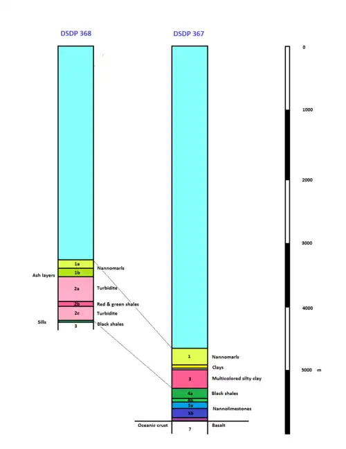 Im Bereich der Bohrung wird die Schwellenregion von rund 149 bis 145 Millionen Jahre BP alter ozeanischer Kruste unterlagert (Kissenlaven des Tithoniums)[2][3]. Darüber legten sich dann ab dem Valanginium pelagische Kalke. Die sich ab dem Albium anschließenden Schwarzschiefer (Untereinheit 3) sind tief marinen Ursprungs; sie wurden in ihrem obersten Abschnitt von der Bohrung angefahren. Im Zeitraum Oberkreide bis einschließlich Aquitanium folgte eine rund 600 Meter mächtige Turbiditsequenz (Untereinheit 2). In Untereinheit 1b kam es dann zu drastischen Änderungen. Die Turbiditsedimentation wich allmählich einer 200 Meter mächtigen, kalkbetonten Sedimentation (Mergel und Kalkschlämme der Untereinheit 1). In etwa gleichzeitig setzte im Burdigal basaltischer Vulkanismus ein, der für das Aufbeulen und Anheben der Schwellenregion letztendlich verantwortlich sein dürfte. Lagergänge drangen in die oberen Schwarzschiefer ein und Aschenlagen finden sich in Untereinheit 1b. Zahlreiche, diapirartig eindringende Vulkanite (engl. volcanic plugs) sind auf dem benachbarten Vema-Profil zu erkennen.