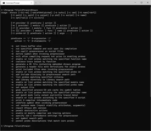 Überwachungsprogramme werden in der Programmiersprache D geschrieben (nicht zu verwechseln mit der Programmiersprache „D“). D ist eine Teilmenge aus C, welche mit zusätzlichen Befehlen, Variablen und eingebauten Funktionen (built-ins) für die Prozessüberwachung erweitert wurde. D-Programme ähneln vom Aufbau her der Programmiersprache awk. Sie bestehen aus einer Liste von Prüfungssonden, wobei jede Prüfungssonde mit einer Aktion verbunden sein kann. Immer wenn die Bedingungen einer Sonde erfüllt sind, wird die damit verbundene Aktion ausgeführt. Eine typische Prüfungssonde ist zum Beispiel das Öffnen einer Datei, das Starten eines Prozesses oder wenn eine Maschineninstruktion an einer bestimmten Hauptspeicheradresse ausgeführt wird.